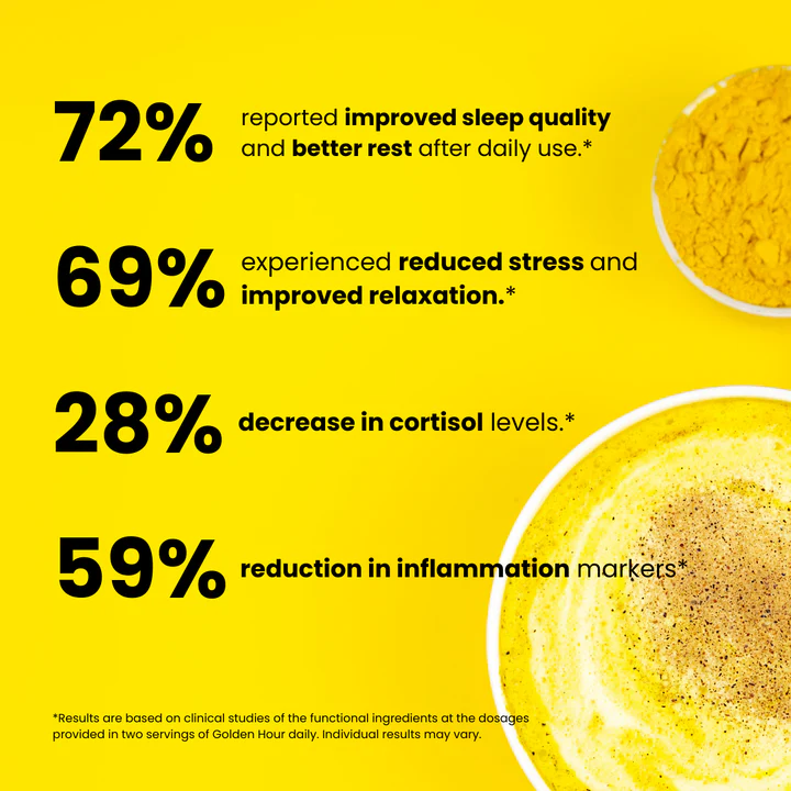 Golden Hour is a golden milk adaptogenic powder inspired by ancient Ayurvedic traditions. Crafted with organic superfoods like turmeric, ginger, and ashwagandha, it’s formulated by dietitians to deliver a delicious, cozy taste that’s perfect for your evening wind-down. Mix it with your favorite milk for a soothing bedtime ritual.